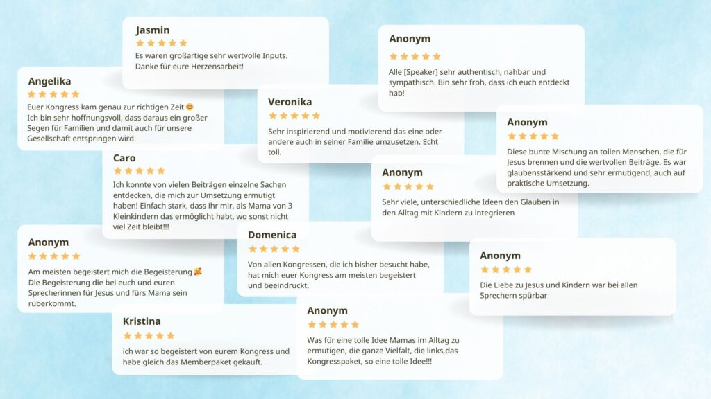 Wenn du möchtest, kannst du gerne unser Kongresspaket kaufen und alle Inhalte zeitlich unbegrenzt anschauen. Damit unterstützt du auch unsere Arbeit, so dass wir uns weiter für christliche Familien einsetzen und neue Inhalte gestalten können.